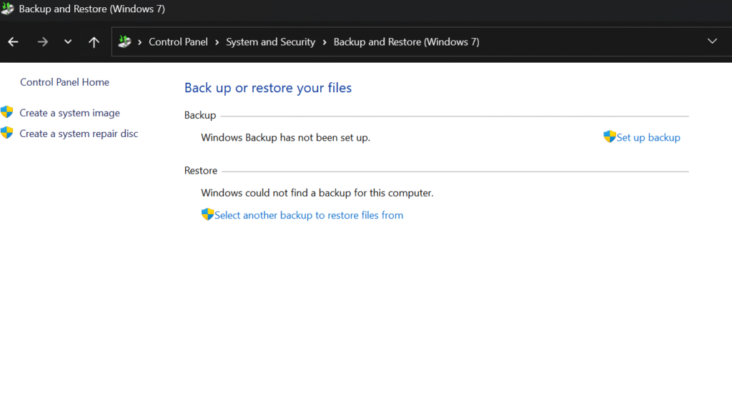 Mở Control Panel → System and Security → Backup and Restore (Windows 7). Đừng nhầm lẫn với thuật ngữ “Windows 7”, đây chỉ là một cái tên cũ mà Microsoft vẫn sử dụng.