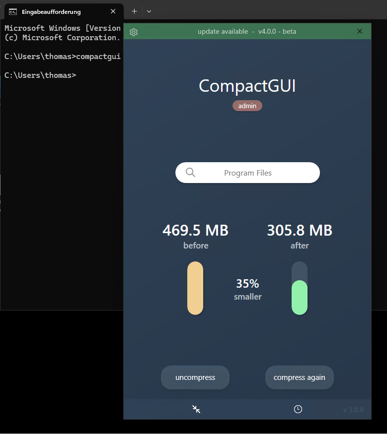 Trong khi CompactGUI dựa trên chương trình phụ trợ “compact.exe” quen thuộc và tích hợp vào menu Explorer với giao diện trực quan, Compactor sử dụng trực tiếp API Windows và do đó cung cấp một số chức năng bổ sung. Ví dụ: công cụ này phân tích các khối dữ liệu trước khi nén và tự động quyết định xem một tệp có thể được nén hay không, loại bỏ các thao tác vô nghĩa trên các tệp không thể nén.