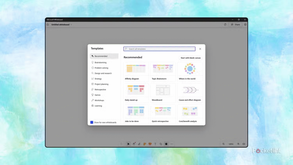 Ứng dụng Whiteboard miễn phí của Microsoft đóng vai trò như một khung vẽ tự do cho phép cộng tác kỹ thuật số và lên ý tưởng cho các dự án sáng tạo cùng đồng nghiệp. Tương tự như ứng dụng Freeform của Apple dành cho iPhone, iPad và Mac, giải pháp Whiteboard độc quyền của Windows là một phần mềm đơn giản và trực quan, cho phép bạn ghi lại ý tưởng mà không bị phân tâm bởi giao diện người dùng trực quan lộn xộn.