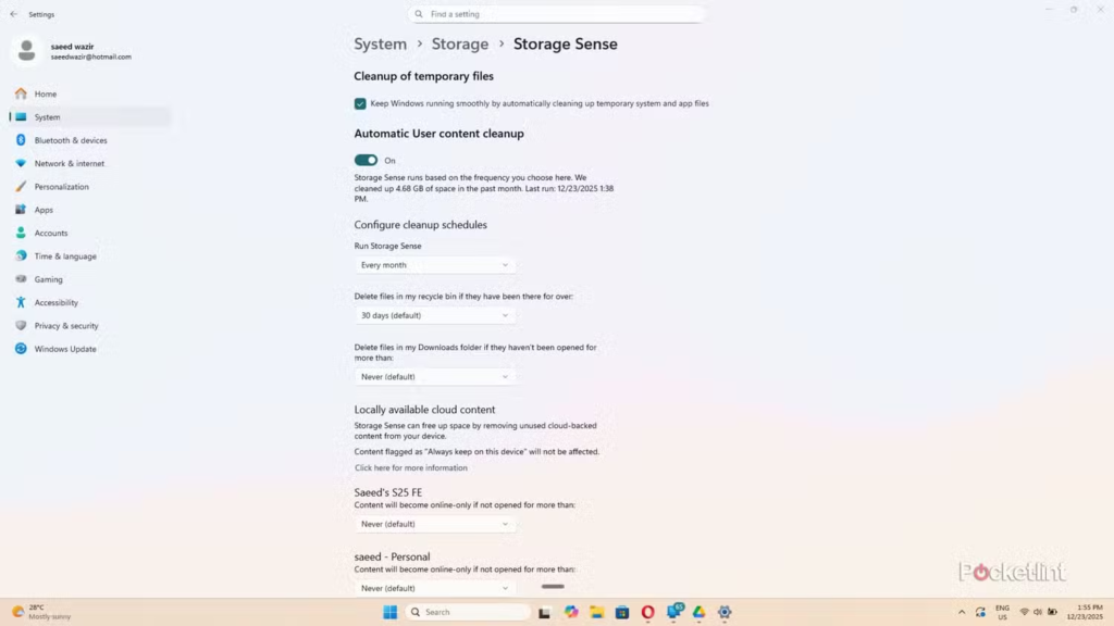 Storage Sense là một công cụ tiện lợi giúp tự động hóa việc quản lý dung lượng ổ đĩa của tôi, nhờ đó tôi không cần tốn thời gian làm thủ công nữa. Tôi có thể cấu hình ứng dụng để tự động xóa các tệp trong thư mục Tải xuống và Thùng rác nếu chúng không được truy cập trong những khoảng thời gian cụ thể. Nó cũng sẽ tự động xóa các tệp tạm thời của ứng dụng và hệ thống để giúp Windows hoạt động trơn tru.