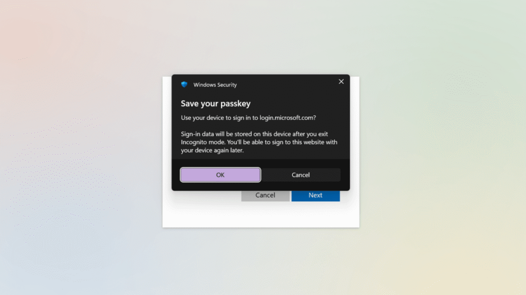- Một màn hình mới sẽ xuất hiện trên tab trình duyệt của bạn, cùng với cửa sổ bật lên của Windows yêu cầu lưu passkey. Nhấp vào OK.