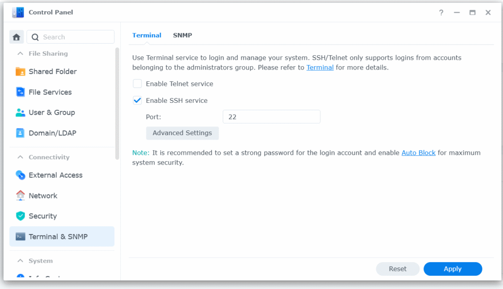 Để bật SSH trong Synology, các bạn vào Control Panel – Terminal & SNMP và Enable SSH service