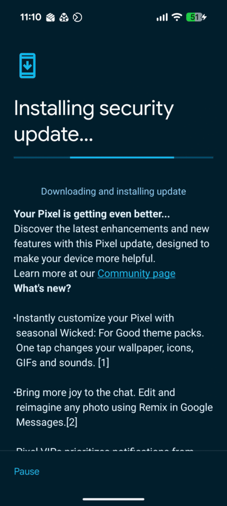 Bản cập nhật cuối cùng cho Android 16 QPR1 đang được triển khai cùng với bản vá bảo mật tháng 11 cho các thiết bị 7a, Tablet, Fold, 8, 8 Pro, 8a, 9, 9 Pro, 9 Pro XL, 9 Pro Fold, 9a, Pixel 10, Pixel 10 Pro, Pixel 10 Pro XL và Pixel 10 Pro Fold. Bản phát hành này đi kèm với một bản vá lỗi tính năng ngoài chu kỳ.