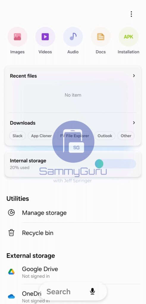 Ứng dụng Tệp của tôi đang được thiết kế lại với một số danh mục hình tròn và nhiều cảm hứng từ Liquid Glass. Mặc dù thiết kế không hoàn toàn giống với giao diện mới của Apple trên iOS 26, nhưng hình dạng và vị trí lại mang đến cảm giác khá giống nhau. Điều này cũng có thể thấy trong hình ảnh của ứng dụng Điện thoại Samsung.