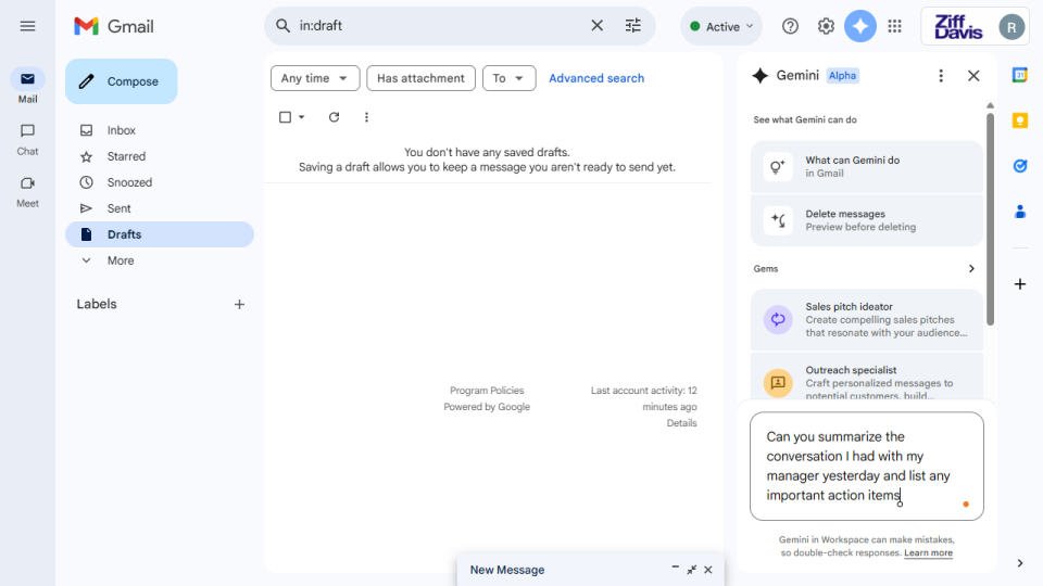 May mắn thay, AI có thể tóm tắt email cho bạn. Nhấp vào biểu tượng Gemini ở góc trên bên phải và yêu cầu nó tóm tắt từng email hoặc chuỗi email dài. Bạn có thể yêu cầu trực tiếp như “Tóm tắt email của Ted”, hoặc bạn có thể yêu cầu Gemini bằng ngôn ngữ tự nhiên hơn. Hơn nữa, Gemini có thể bao gồm email từ (hoặc đến) những người cụ thể hoặc trong một khoảng thời gian nhất định, cùng nhiều tính năng khác. Ví dụ: bạn có thể yêu cầu Gemini tóm tắt cuộc trò chuyện với quản lý của mình và rút ra những hành động quan trọng. Việc dựa vào AI có thể dễ dàng hơn so với việc tự mình lướt qua các chuỗi email dài dòng.