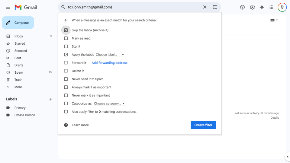 Đây là một chiến lược tuyệt vời để sử dụng khi bạn đăng ký tài khoản web hoặc ứng dụng mới. Nếu bạn tạo tài khoản trên trang web của J.Crew, chẳng hạn, bạn có thể sử dụng địa chỉ [email protected] làm tên đăng nhập. Sau khi tạo bộ lọc cho địa chỉ này, như trong bước trên, Gmail sẽ tự động chuyển hướng tất cả email của J.Crew đến một thư mục chuyên dụng.