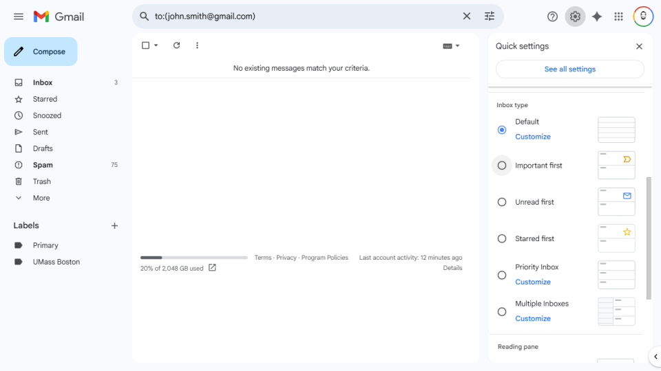 Nhấp vào biểu tượng bánh răng cưa ở góc trên bên phải bảng điều khiển Gmail của bạn và cuộn xuống phần “Loại Hộp thư đến”. Một số tùy chọn để tùy chỉnh hộp thư đến của bạn có sẵn tại đây: