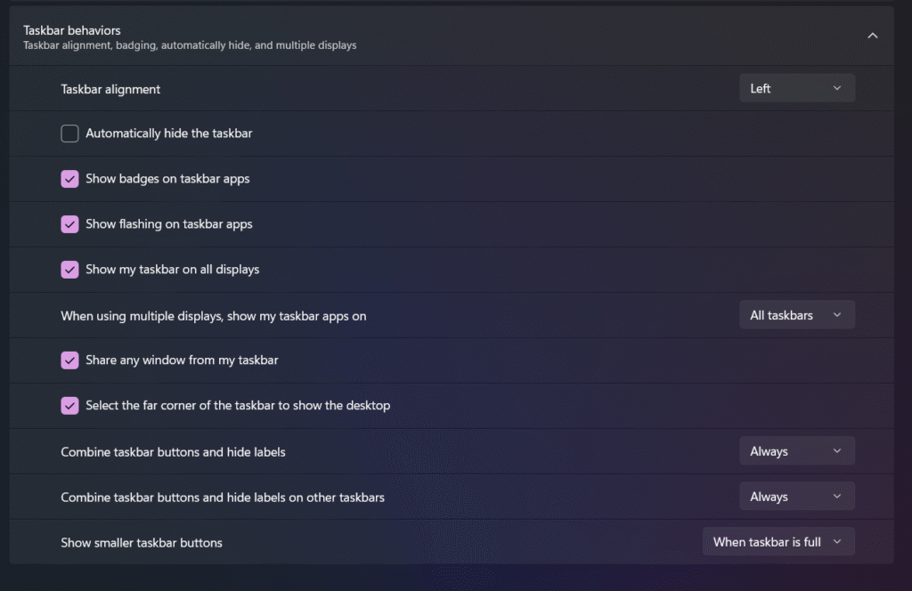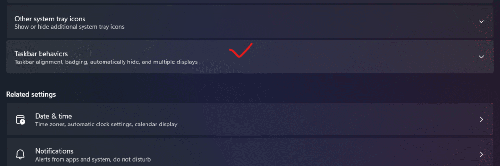 - Tìm trong menu có mục “Taskbar behaviors” và nhấn vào mũi tên xổ xuống