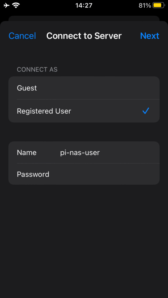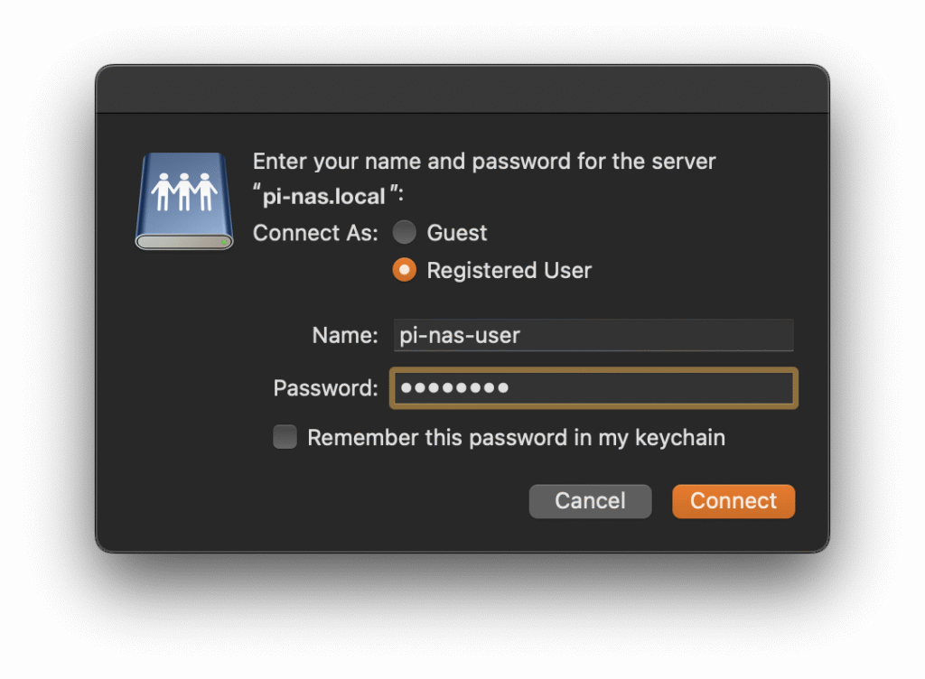 Nhập tên người dùng pi-nas-user và mật khẩu bạn đã chọn ở bước Cấp quyền truy cập ổ đĩa: