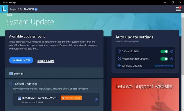 Sử dụng Lenovo Vantage và nó sẽ tự động tìm BIOS mới nhất và update cho bạn khi có BIOS mới nhất.