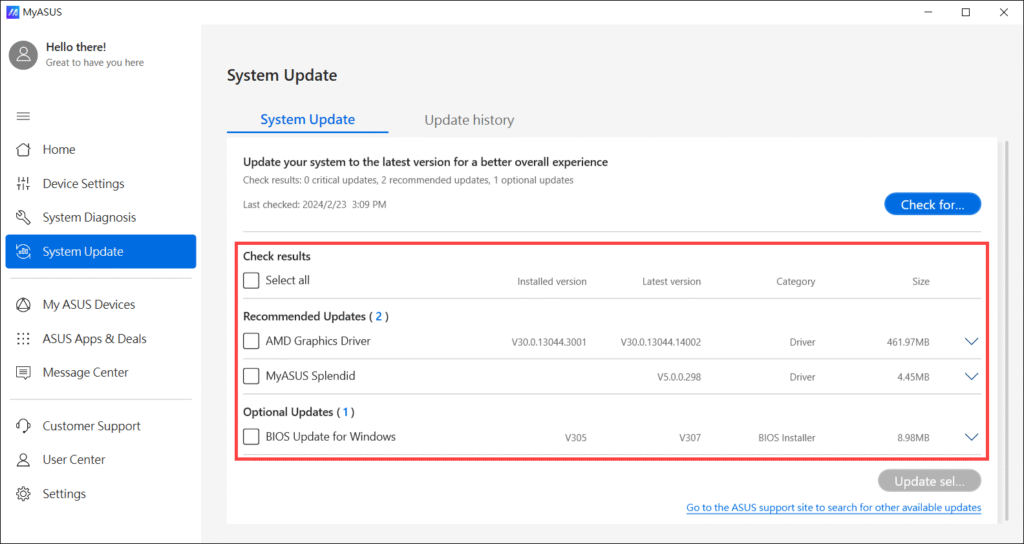 • Tìm và chọn chức năng cập nhật hệ thống hoặc driver.