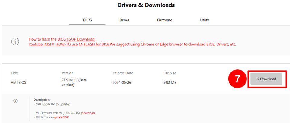 • Luôn tải file BIOS chính xác cho dòng bo mạch chủ hoặc laptop của bạn: từ trang hỗ trợ của MSI.
