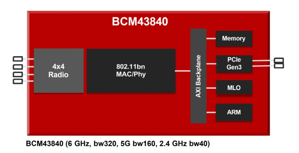 - BCM43840 – Four-stream (4×4) Wi-Fi 8 radio up to 320 MHz bandwidth, up to 4K-QAM modulation, 11.5 Gbps peak link rate