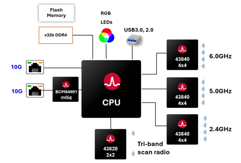 - BCM43820 – Two-stream (2×2) scanning and analytics Wi-Fi 8 radio up to 320 MHz bandwidth, up to 4K-QAM modulation, 5.76 Gbps peak link rate