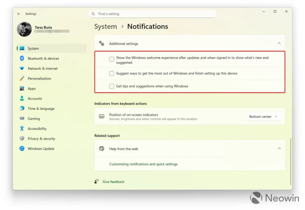 Mẹo: Khi đã vào màn hình nền, hãy vào Settings > System > Notifications > Additional settings và bỏ chọn cả ba tùy chọn. Thao tác này sẽ đảm bảo bạn không nhận được thông báo toàn màn hình kèm theo quảng cáo của Microsoft khi bật máy tính lần sau.