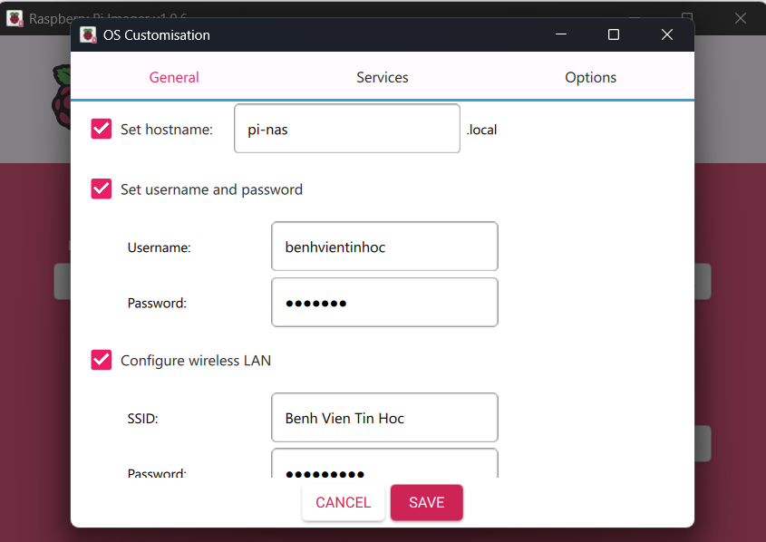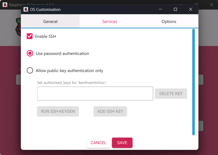 - Nhấn luôn vào ô Enable SSH để bạn có thể kết nối Pi mà không cần chuột với bàn phím gắn trực tiếp vào Pi