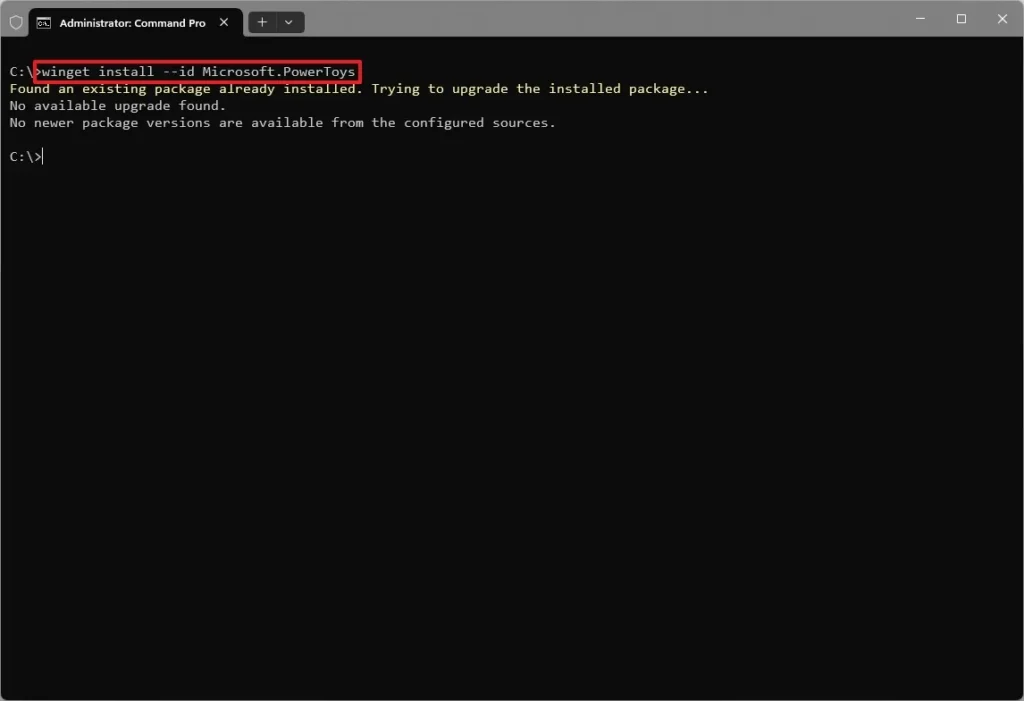 - Nhập lệnh sau để cài đặt phiên bản mới nhất của công cụ và nhấn Enter: winget install –id Microsoft.PowerToys