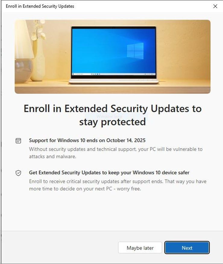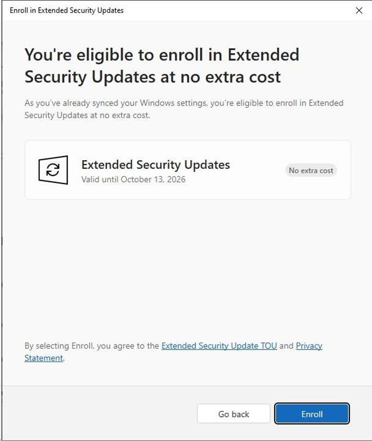 Thông báo về việc cung cấp đăng ký ESU miễn phí áp dụng cho hàng chục triệu máy tính cá nhân không đủ điều kiện nâng cấp lên Windows 11 miễn phí vì không đáp ứng các yêu cầu về khả năng tương thích. Đáng tiếc là khách hàng doanh nghiệp không đủ điều kiện nhận các tùy chọn miễn phí này và sẽ phải trả mức giá cao hơn đáng kể (bắt đầu từ 61 đô la mỗi thiết bị mỗi năm, sau đó tăng gấp đôi mỗi năm) trong tối đa ba năm đăng ký ESU thương mại. Các tùy chọn doanh nghiệp này có sẵn thông qua Chương trình Cấp phép Số lượng lớn của Microsoft hoặc thông qua các đối tác Nhà cung cấp Dịch vụ Đám mây của Microsoft.