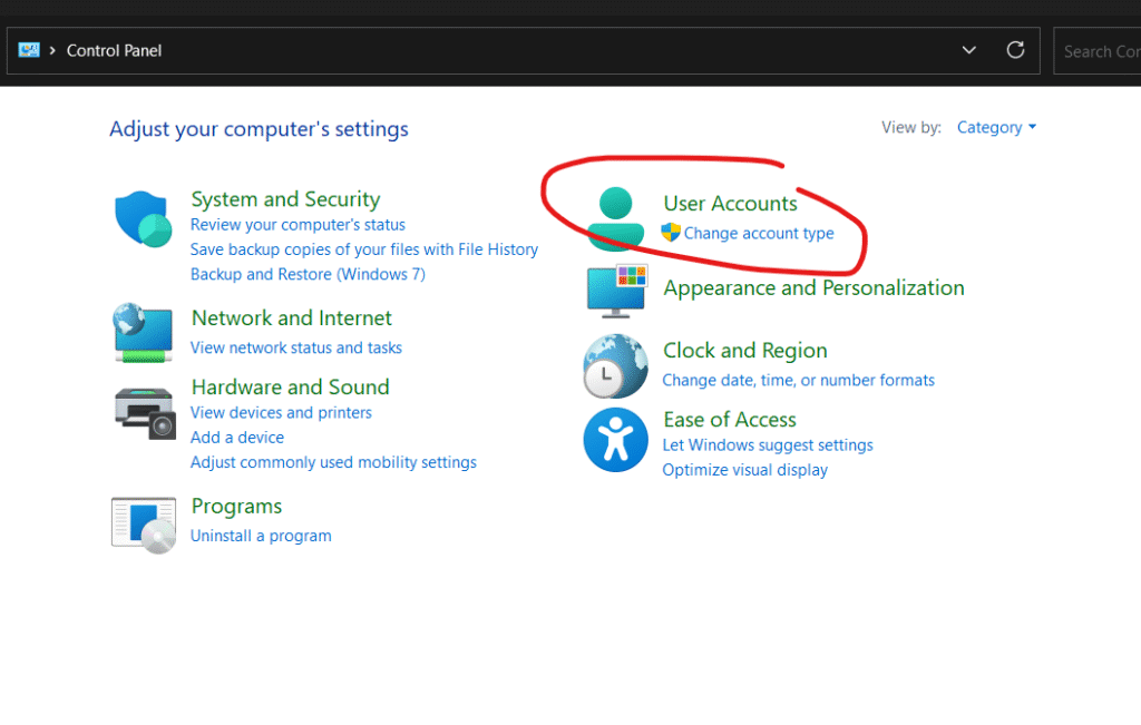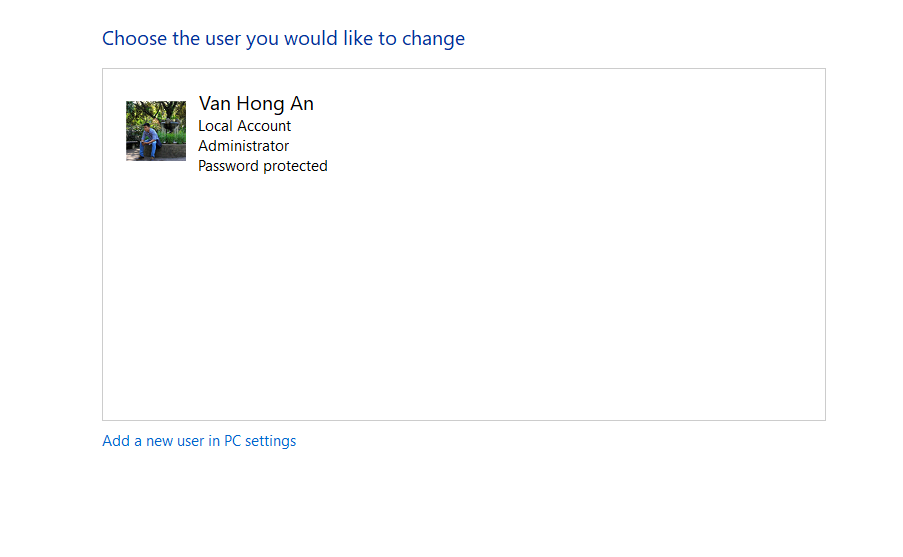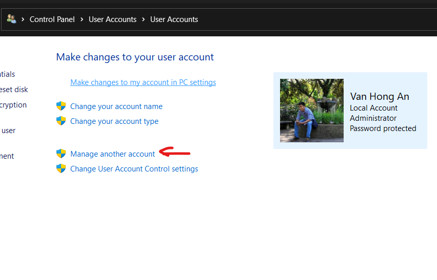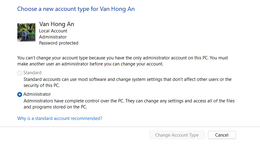 Bạn muốn chỉnh cho User đó thành administrator thì vào Control Panel -> User Accounts