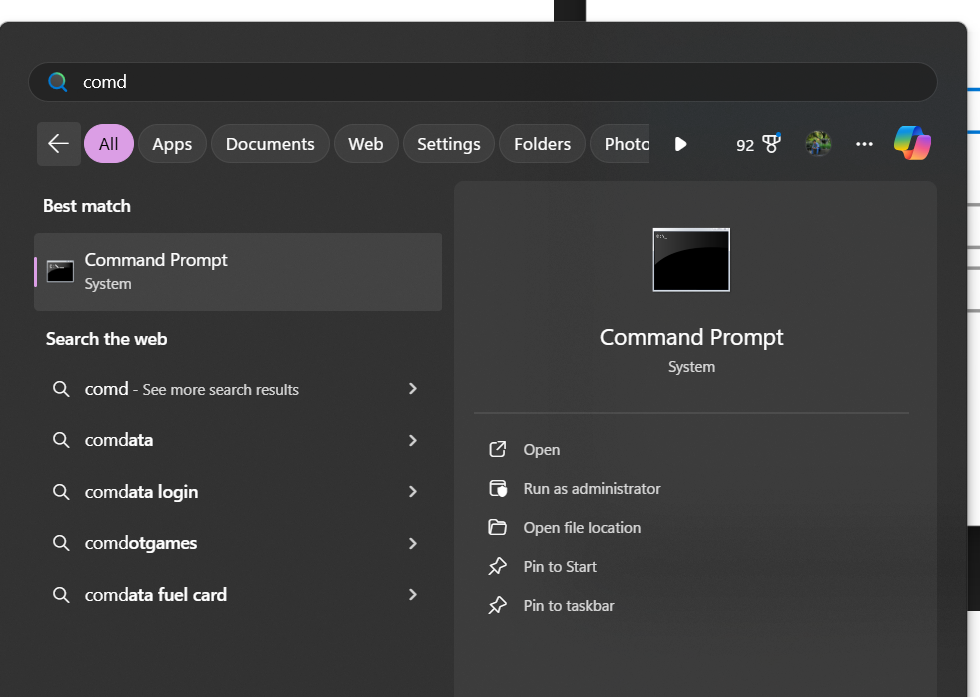 Gõ command promt trong ô tìm kiếm và chọn Run as administrator