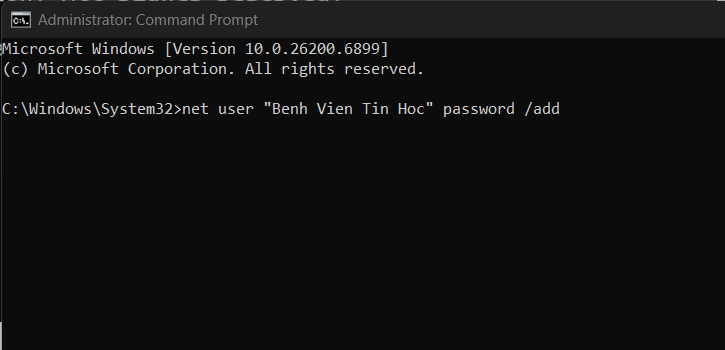 Nhập theo cú pháp sau (trong đó Ten User là user bạn muốn tạo, nếu có khoản cách thì thêm ” vào đầu và cuối user.
