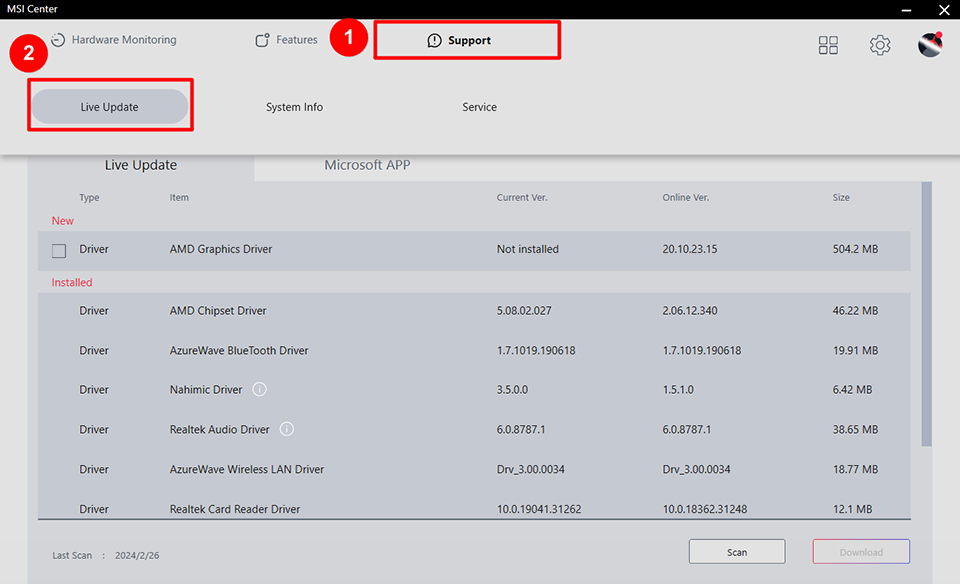 Mở MSI Center → nhấn vào “Support” → nhấn “Live Update” → tiếp “Scan” → chọn driver bạn muốn Update và nhấn Download và chạy cài đặt