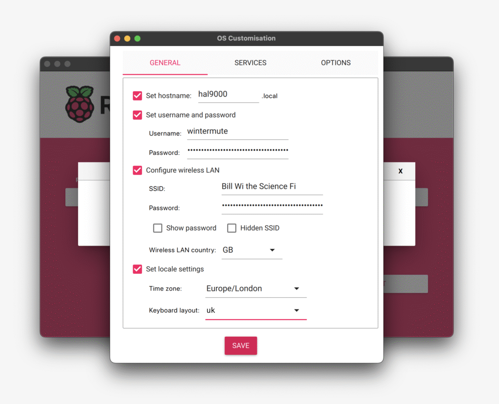 Tùy chọn wireless LAN cho phép bạn nhập SSID (tên) và mật khẩu cho mạng không dây của mình. Nếu mạng của bạn không phát sóng SSID công khai, bạn nên bật cài đặt “Ẩn SSID”. Theo mặc định, Imager sử dụng quốc gia bạn hiện đang ở làm “Quốc gia mạng LAN không dây”. Cài đặt này kiểm soát tần số phát sóng Wi-Fi được Raspberry Pi sử dụng. Nhập thông tin đăng nhập cho tùy chọn mạng LAN không dây nếu bạn định chạy Raspberry Pi không cần màn hình.