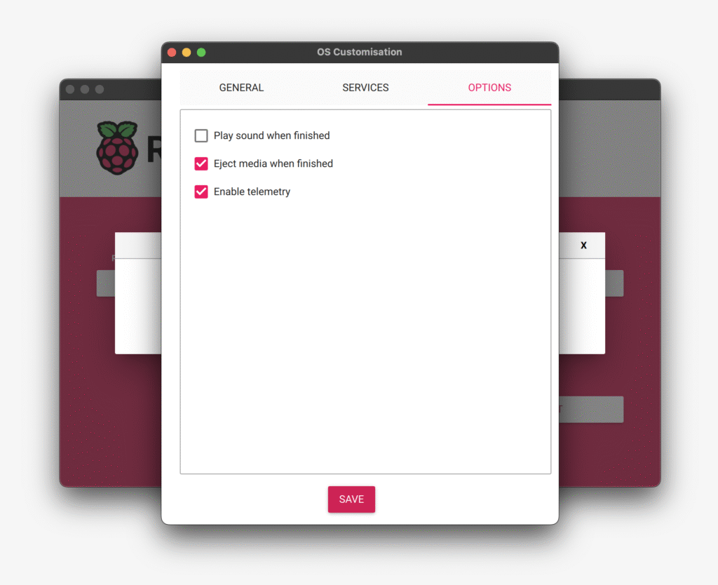 Tùy chỉnh hệ điều hành cũng bao gồm menu Options cho phép bạn cấu hình hành vi của Imager trong quá trình ghi. Các tùy chọn này cho phép bạn phát ra âm thanh khi Imager hoàn tất việc xác minh hình ảnh, tự động ngắt kết nối phương tiện lưu trữ sau khi xác minh và tắt tính năng đo từ xa.
