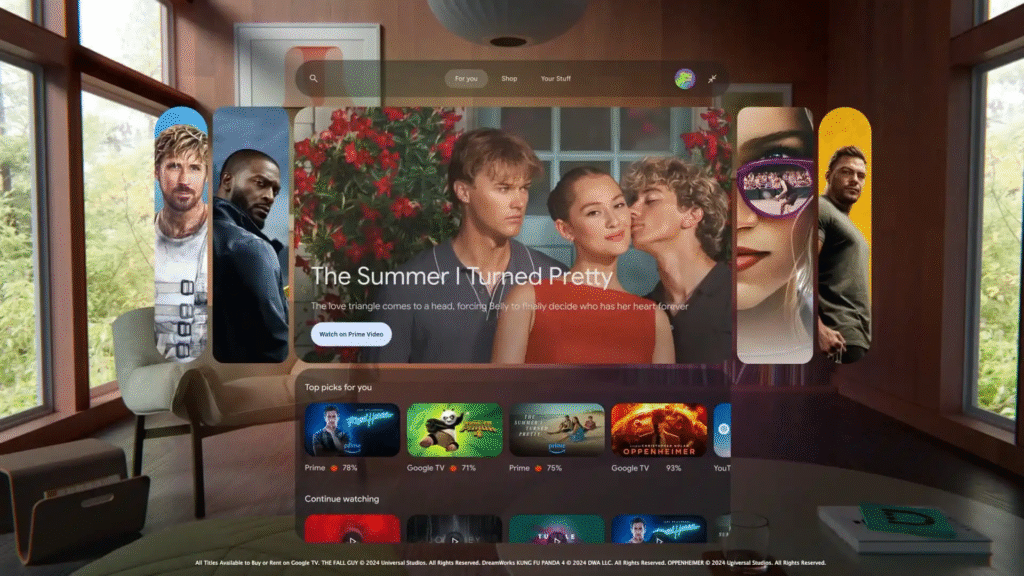 Về mặt giải trí, Google Photos có thể tăng thêm chiều sâu cho ảnh và video 2D của bạn. YouTube được quảng cáo là sở hữu “thư viện nội dung VR 180 độ và 360 độ nhập vai lớn nhất thế giới”. Ngoài ra còn có một tab không gian mới để tìm nội dung 3D. Trong khi đó, Google TV cung cấp một môi trường rạp chiếu phim ảo. Ngoài ra còn có các ứng dụng phát trực tuyến từ HBO Max, Peacock, Crunchyroll, v.v., cũng như các “trò chơi nhập vai” từ Owlchemy Labs, Mirrorscape và Resolution Games, nơi Gemini có thể cung cấp hướng dẫn và mẹo theo thời gian thực.