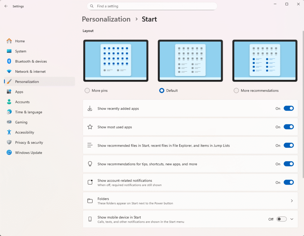 Đồng thời, Microsoft đã đơn giản hóa các thiết lập của Menu Bắt đầu. Các tùy chọn bố cục trước đây đã bị loại bỏ; thay vào đó, tùy chọn “Hiển thị tất cả các ghim theo mặc định” cung cấp một tùy chọn điều khiển trung tâm duy nhất. Kích thước trực quan của menu Bắt đầu mới cũng được điều chỉnh theo tỷ lệ màn hình.