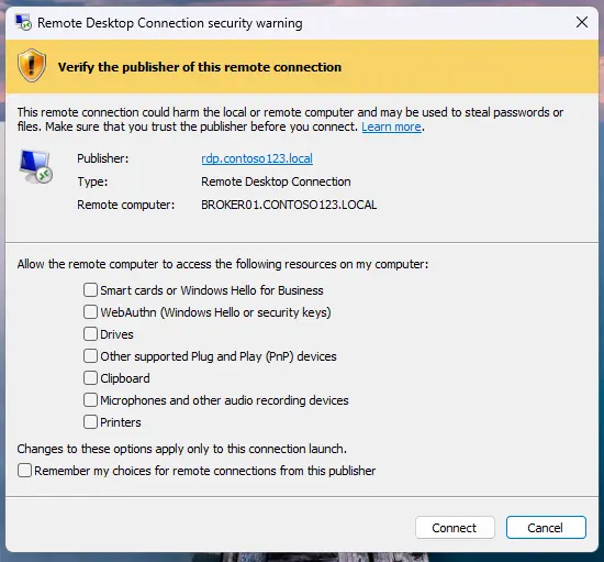 Các biểu ngữ sẽ hiển thị địa chỉ máy tính từ xa, thông tin nhà phát hành (nếu có) và bất kỳ yêu cầu truy cập nào vào tài nguyên cục bộ. Tất cả các cài đặt được yêu cầu đều bị vô hiệu hóa theo mặc định, nghĩa là người dùng phải bật chúng một cách rõ ràng trước khi kết nối. Ngoài ra, một cảnh báo một lần sẽ xuất hiện lần đầu tiên khi tệp RDP được mở để cảnh báo người dùng về các rủi ro. Nó chỉ được kích hoạt khi mở tệp RDP.