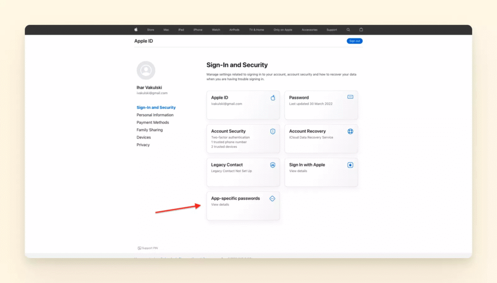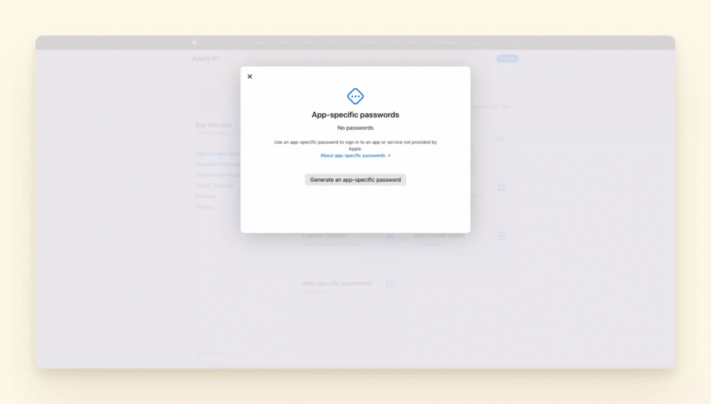 - Từ mục Đăng nhập và Bảo mật, chọn App-Specific Passwords > Generate an app-specific password.