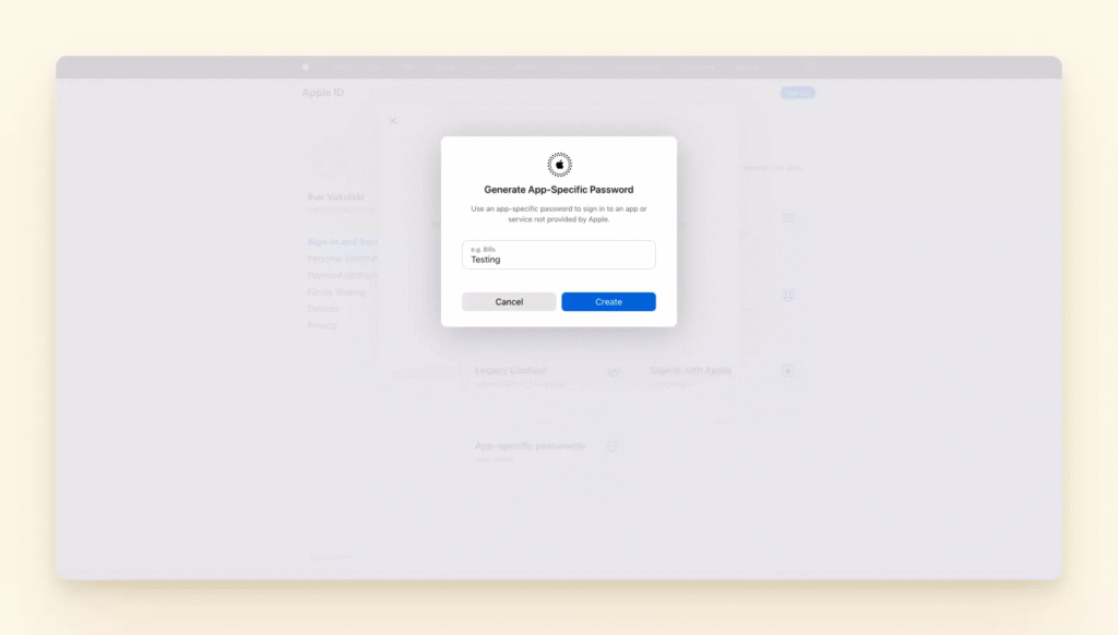 - Nhập tên cho Mật khẩu Dành riêng cho Ứng dụng và chọn Tạo. (Nếu được nhắc, hãy nhập mật khẩu iCloud của bạn và chọn Tiếp tục.)