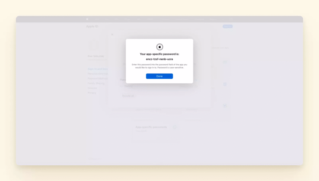 - Sao chép mật khẩu dành riêng cho ứng dụng và chọn Hoàn tất. Mật khẩu ứng dụng thường có 16 ký tự được phân tách bằng dấu gạch ngang, chẳng hạn như xxxx-xxxx-xxxx-xxxx. Mật khẩu ứng dụng phân biệt chữ hoa chữ thường.