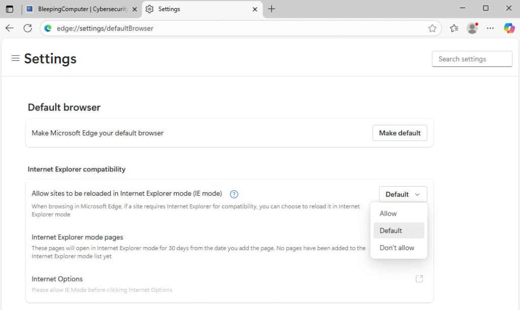Mặc dù hỗ trợ cho Internet Explorer đã kết thúc vào ngày 15 tháng 6 năm 2022, Microsoft Edge vẫn có chế độ IE để tương thích với các công nghệ cũ hơn (ActiveX và Flash) vẫn được sử dụng trong một nhóm nhỏ các ứng dụng doanh nghiệp và cổng thông tin chính phủ.