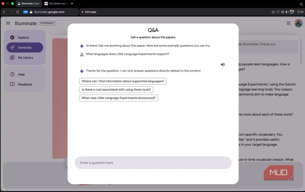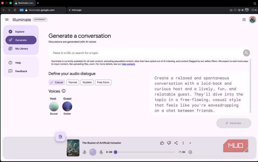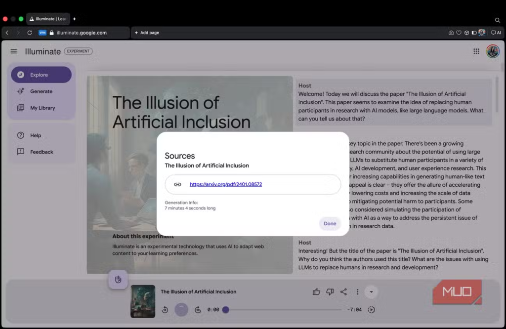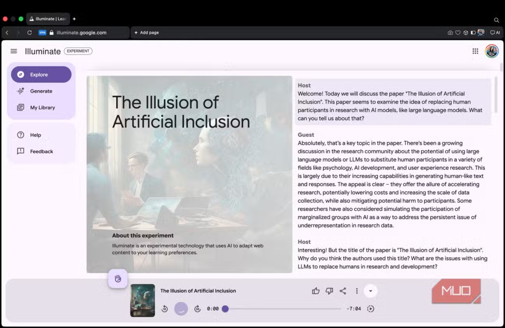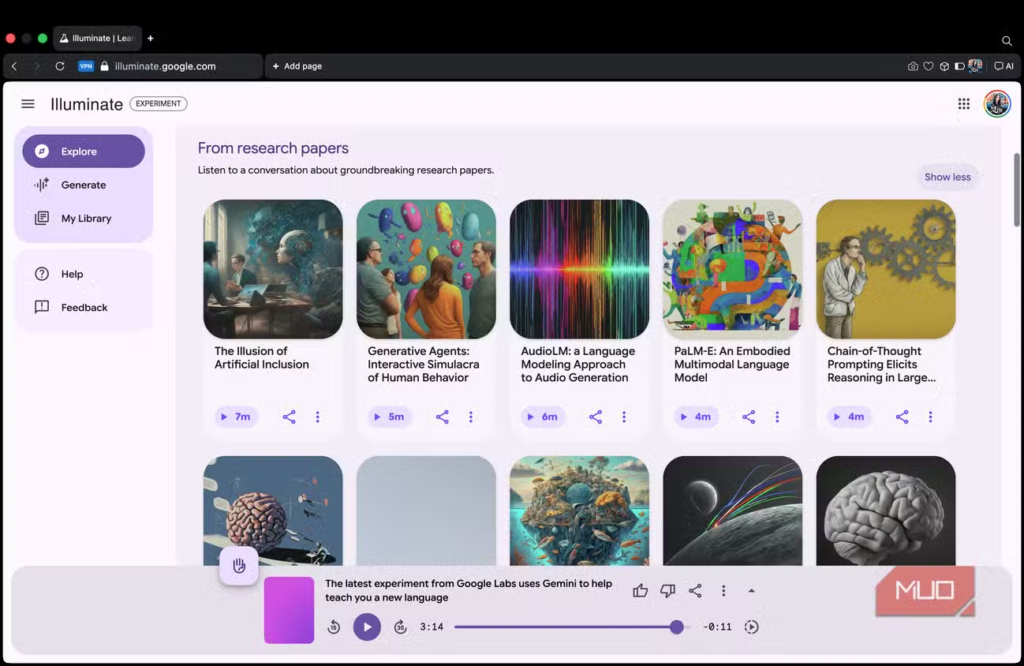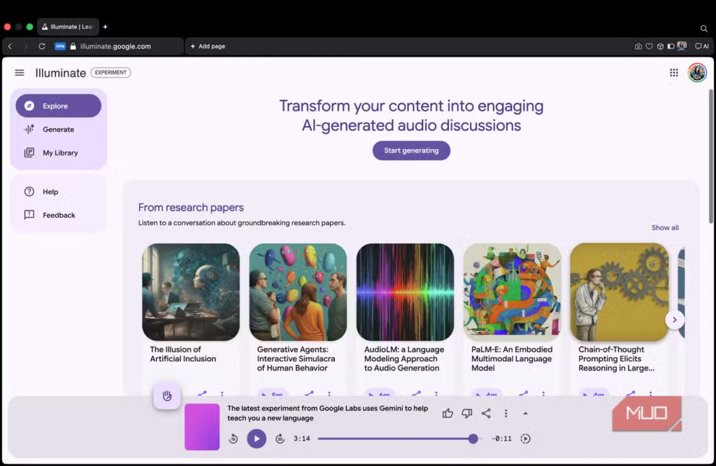 Tuy nhiên, Illuminate không được thiết kế để biến bất kỳ nội dung nào bạn tải lên thành podcast, điều mà NotebookLM làm được. Thay vào đó, trọng tâm chính của nó dường như là chuyển đổi các bài nghiên cứu thành các cuộc thảo luận âm thanh dài năm phút. Mặc dù được xây dựng dựa trên ý tưởng chuyển đổi các bài nghiên cứu thành Tổng quan âm thanh, nhưng xét cho cùng, Illuminate cho phép bạn chuyển đổi bất kỳ nội dung web nào thành các cuộc thảo luận âm thanh miễn là nội dung đó không bị giới hạn truy cập, đến từ một trang web đã từ chối lập chỉ mục hoặc chứa nội dung vi phạm các bộ lọc an toàn của Illuminate.