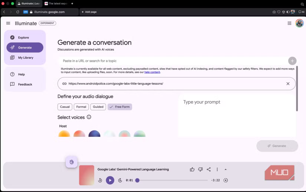 Tùy chọn “Dạng Tự Do” cho phép bạn hoàn toàn tự viết lời nhắc từ đầu, cho phép bạn tùy chỉnh nội dung, phong cách và trọng tâm của cuộc thảo luận theo nhu cầu cụ thể của mình. Không giống như NotebookLM, Illuminate cũng cho phép bạn chọn giọng nói của người dẫn chương trình nếu bạn chọn tùy chọn “Dạng Tự Do”.