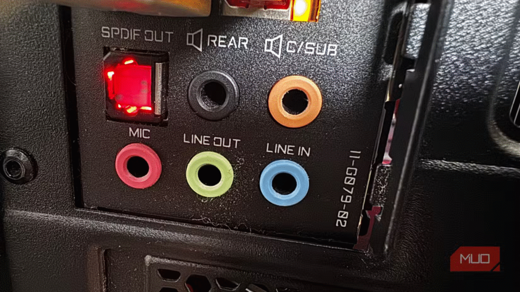 Máy tính của bạn cũng có thể có cổng ra âm thanh quang (được gắn nhãn SPDIF cho Giao diện Kỹ thuật số Sony/Philips), có thể nhận biết bằng đèn đỏ bên trong. Định dạng này không phổ biến bằng âm thanh qua USB hoặc cáp analog; việc sử dụng nó đã giảm dần theo thời gian.