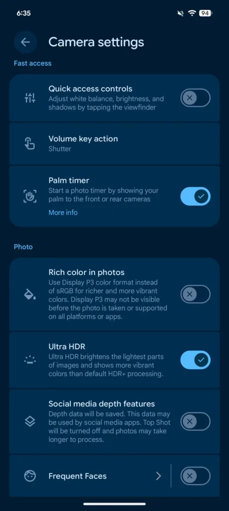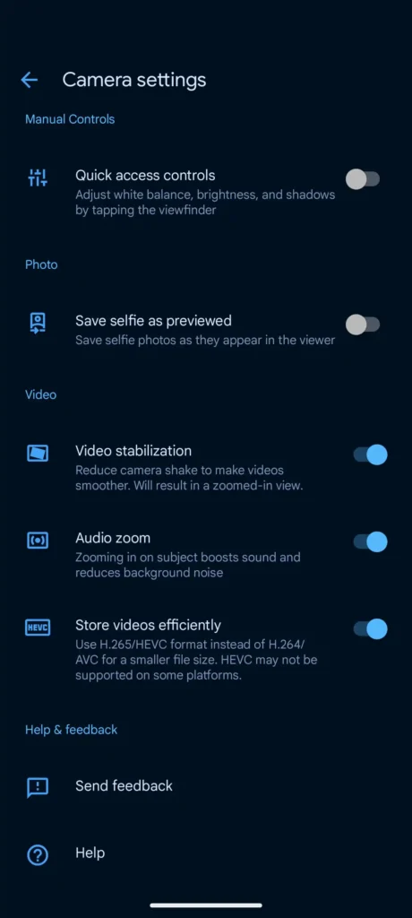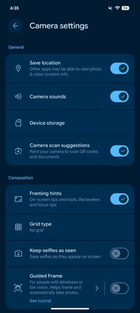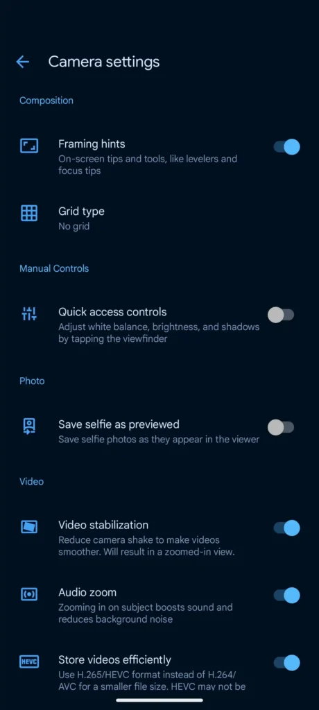 Trang “Cài đặt camera” sử dụng các vùng chứa Material 3 Expressive để nhóm các tùy chọn liên quan và kiểu chuyển đổi mới nhất. Danh sách này tùy thuộc vào thiết bị, nhưng trên Pixel 8 Pro, bạn có: