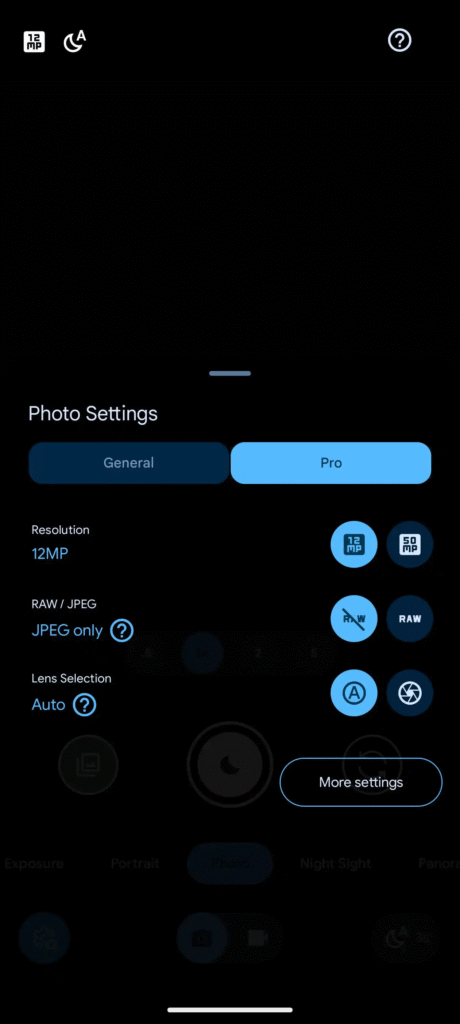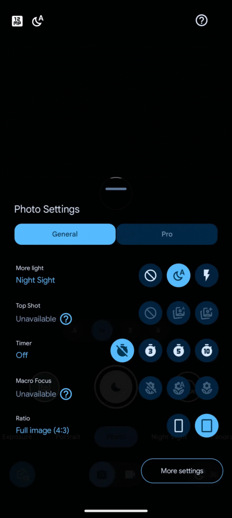 Các nút điều khiển không hoạt động trong “Photo Settings” giờ đây cũng được bo tròn thành hình vuông, trong khi những gì được chọn sẽ được đặt trong hình tròn. Các tab trên cùng “General” và “Pro” cũng được xử lý tương tự. Nút “More settings” ở cuối trang đã được di chuyển lên góc trên bên phải của trang tính với biểu tượng dấu ba chấm. Điều này giúp thu nhỏ chiều cao của bảng điều khiển để dễ dàng sử dụng bằng một tay hơn.
