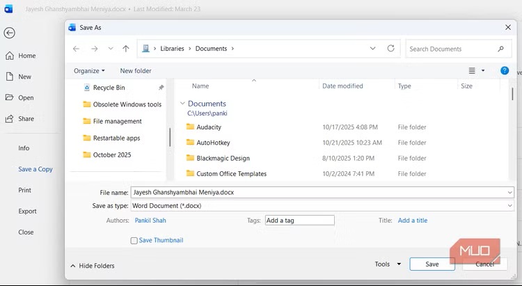 Bạn cũng có thể thêm thẻ tag trực tiếp trong các ứng dụng Office như Word, Excel hoặc PowerPoint. Khi lưu tài liệu hoặc bảng tính, bạn có thể thêm thẻ vào thuộc tính tài liệu. Bằng cách này, tệp sẽ giữ nguyên thẻ tag của nó bất kể nó được di chuyển đến đâu trên PC của bạn.