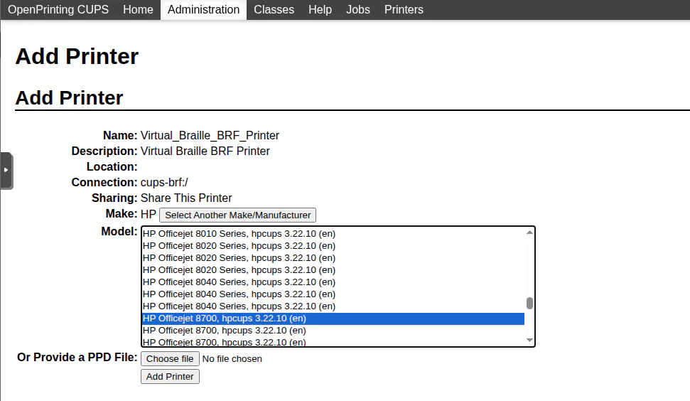 ● Đối với các máy in cổng USB cắm vào Raspberry Pi, hầu hết các dòng máy in đều nhận dạng tự động bởi CUPS. Bạn có thể chỉ cần chọn đúng driver hoặc tải driver file PPD lên.