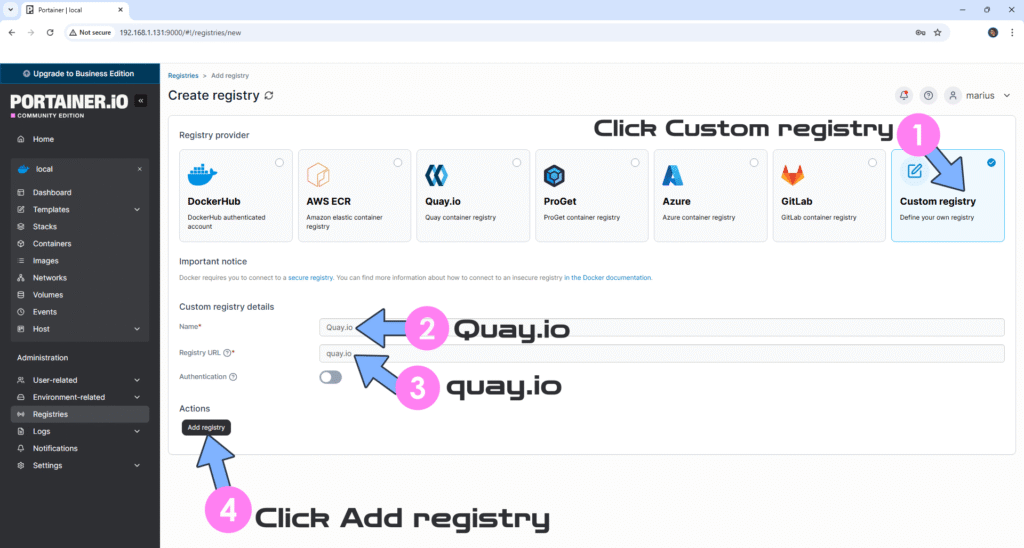 Nhấn +Add registry và Custom registry. Tại mục Name nhập Quay.io và tại Registry URL nhập quay.io