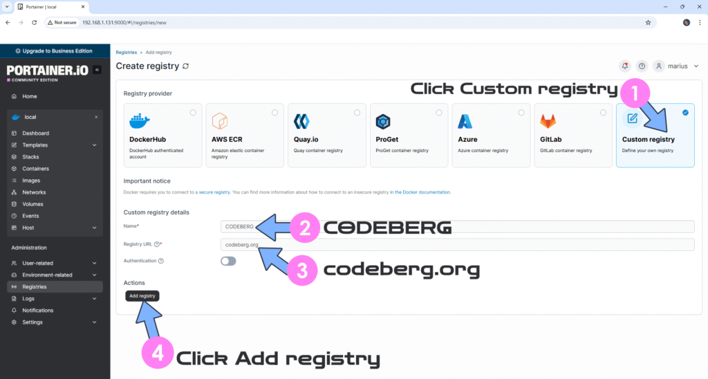 Nhấn tiếp +Add registry sau đó chọn Custom registry. Tại mục Name nhập CODEBERG và tại Registry URL nhập codeberg.org