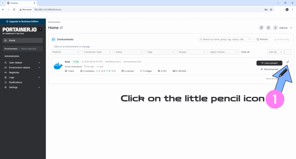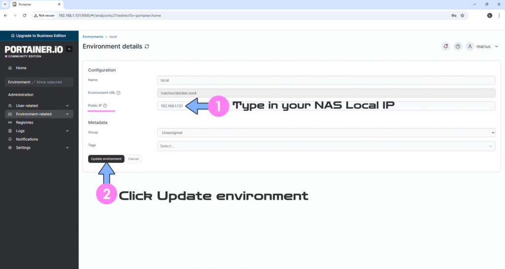 Sau khi nhấn vào biểu tượng cây bút, 1 trang mới sẽ hiện ra. Tại mục Public IP , nhập địa chỉ IP Local của NAs bạn, trong trường hợp này NAS của tôi là 192.168.1.131 sau đó nhấn Update environment.