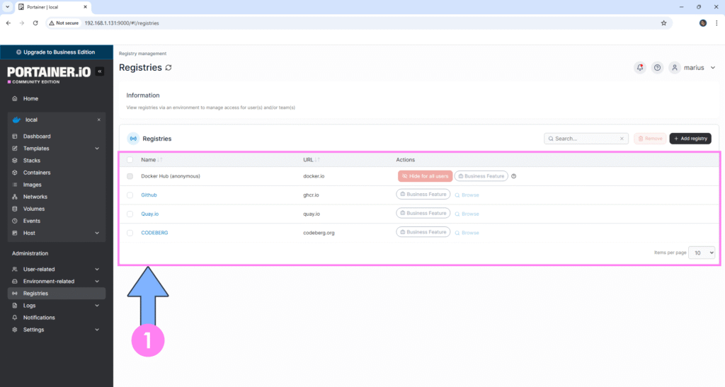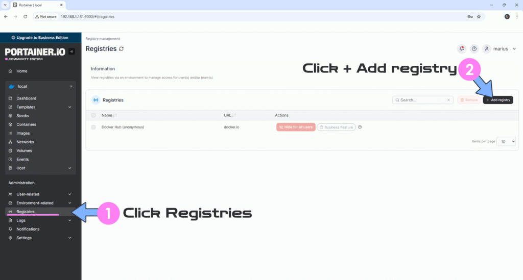 Bên menu bên trái, nhấn Registries sau đó nhấn Add registry.