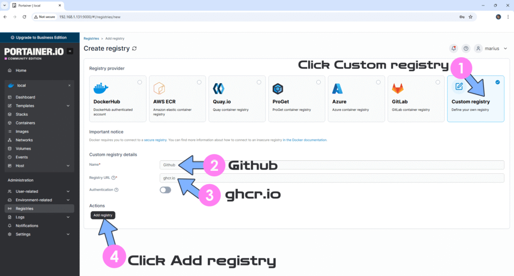 Nhấn vào Custom registry. Tại mục Name nhập Github và mục Registry URL nhập ghcr.io
