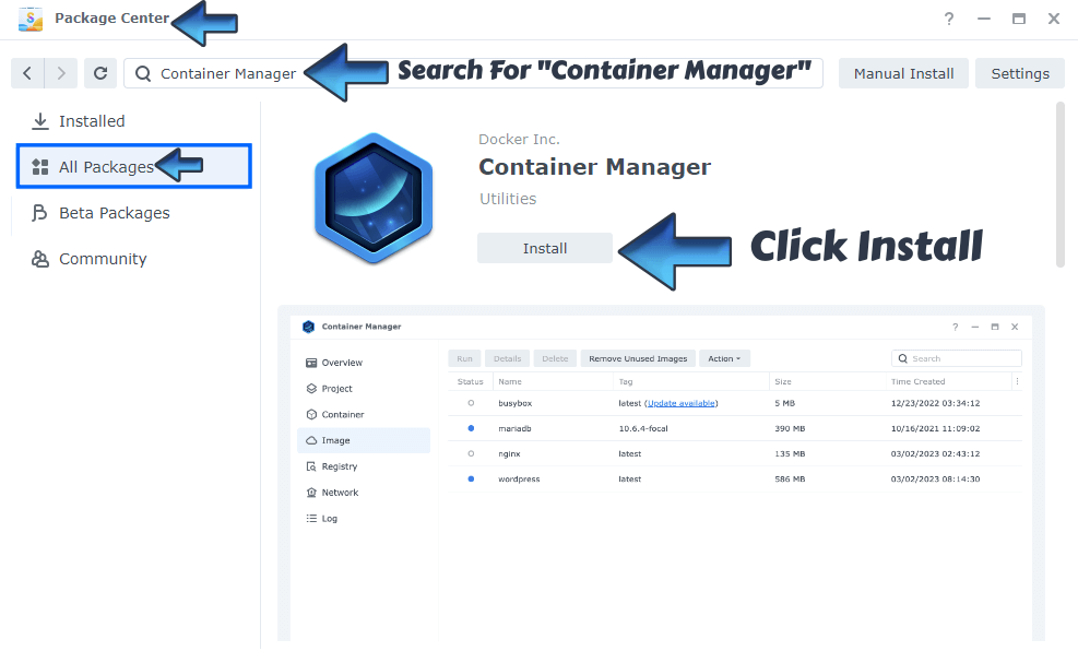 Cài đặt Container Manager thông qua “Package Center” trên Synology. Nếu bạn chạy phiên bản DSM cũ hơn (dưới 7.2), hãy tìm gói Docker thay vì Container Manager.
