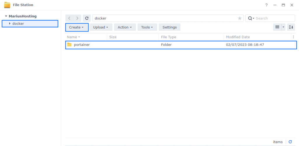 Chọn mục File Station và mở thư mục docker. Bên trong thư mục docker, tạo 1 folder mới đặt tên nó là portainer như hình dưới