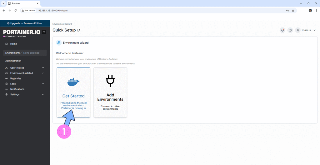 Nhấn Get Started (proceed using the local environment in which Portainer is running in). Như hình bên dưới